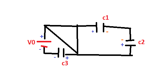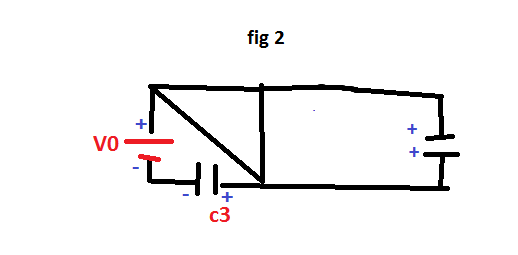 luego sé que todos funcionan asi que junte el capacitor 1 con el 2 en serie para resolver la C eq (ver fig 2) pero resulta que ahi me quedaría el condensador con el mismo potencial en cada placa asi que no hay diferencia de potencial y por lo tanto no se carga y no funciona, o me equivoco ? como tendria que resolverlo entonces, saludos