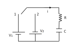 En el circuito de la figura, el interruptor esta trabajando en regimen permanente conectado al punto 1. En t=0 el interruptor pasa a la posicion 2 permaneciendo durante 15s, despues pasa de nuevo a la posicion 1 permaneciendo 25s y finalmente pasa de nuevo a 2 permaneciendo allı el resto del tiempo. Determinar el valor de la tension en el condensador a los 40 s y la forma de onda de la tension en el condensador desde t=0 hasta 50 segundos. (R = 5Ω, C = 2F V1 = 10V y V2 = 10V .