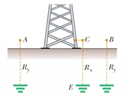 "La resistencia Rx se encuentra entre los puntos C y E (el cual se encuentra inaccesible para la medida directa por estar bajo la superficie de la Tierra). Dos varas se introducen en A y B, y con ellas dos resistencias Ry. El procedimiento consiste en medir la resistencia R1 entre los puntos A, B, después conectar A y B con un conductor y medir la resistencia R2 entre A y C. a) Encuentra la expresión de Rx en términos de las resistencias R1 y R2".