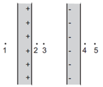 La figura a continuacion muestra dos placas infinitas,delgadas,planas,y paralelas. las placas tienen cargas de misma magnitud, pero de signos opuestos,distribuidos uniformemente en las superficies internas. ordene de menor a mayor la magnitud del campo eléctrico en los 5 puntos mostrados a continuación.