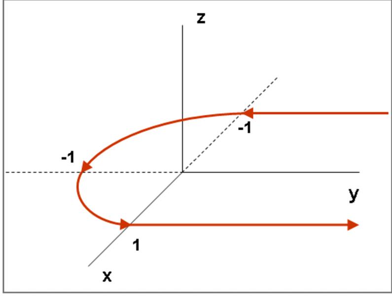 Una corriente eléctrica I se desplaza siguiendo tres segmentos de trayectoria diferentes como se aprecia en la figura. El primer segmento viene desde el infinito, paralelo al eje Y hasta el punto (-1,0,0). El segundo segmento es un semicírculo que empieza en (-1,0,0) y recorre hasta (1,0,0). El tercer segmento es de nuevo una paralela al eje Y que empieza en (1,0,0) y termina en el infinito.