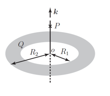 El disco Hueco de la figura se encuentra en el plano xy, su centro coincide con el origen o y su carga Q esta uniformemente distribuida.