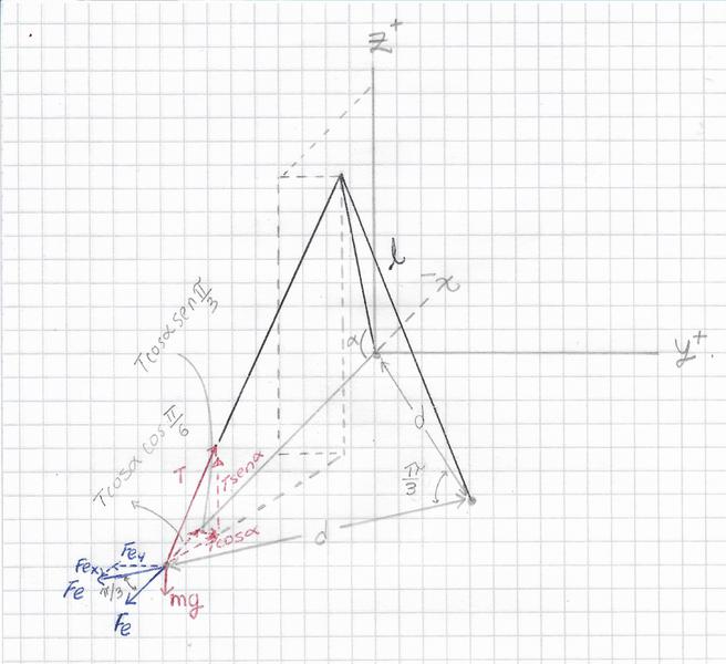 Ahora bien. Decidí basarme en un ejercicio análogo con dos cargas suspendidas tambien de un hilo. Allí, se igualaban las tensiones y podía resolver y encontrar una expresión para . El asunto aquí, es que no sé que hacer porque ¡tengo 3 ecuaciones con la !. Lo otro, es que no sé si tengo un error, porque aunque fui cuidadoso, tengo una duda con la expresión que obtendría para de la sumatoria de fuerzas en x y y: