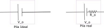 Edito la resistencia interna de la pila real es imposible de separar de la fuente electromotriz , el esquema eléctrico de una pila real comparado con una ideal es el siguiente,