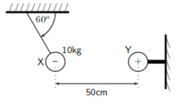 En el diagrama de abajo X es una esfera metálica cargada negativamente y tiene una masa de 1 kg. Y es otra esfera similar a la primera, se encuentra amarrada a la pared por un soporte aislante. La carga de la esfera Y es igual a la carga de la esfera X, pero de signo distinto. ¿Cuánto vale la carga de X?