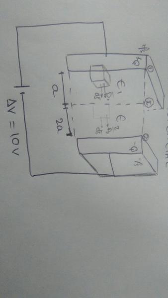 Bueno para comenzar he utilizado la ley de Gauss para dieléctricos \ointDds=Qn, use un cubo como mi superficie imaginaria de manera que se encierre las cargas, luego he dibujado los respectivos vectores P y unitario normal para hallar el índice a) en conclusión la respuesta me salio igual a Eo*a, el problema me surgio en el índice b) de que manera hago la variación de voltaje si esta conectado a una batería?, acaso \DeltaV=0 ?