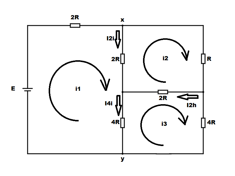 *La 1ª malla la de la izquierda, formada por la fuente E y las resistencias 2R, 2R y 4R en la que supongo el sentido positivo de circulación de la corriente el de las agujas del reloj.
