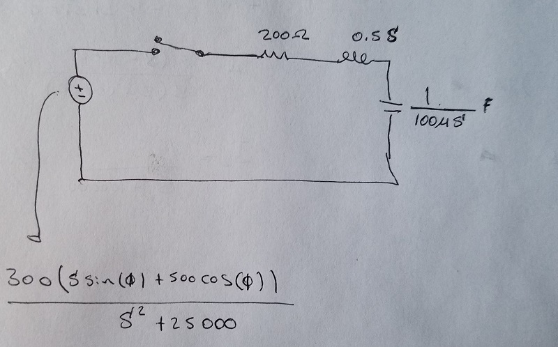 Un circuito RLC en serie, con R = 200 , L = 0.5 H, y C = 100 F, tiene una fuente de voltaje senoidal v = 300 sen ( 500t + ) ( V ) . Encuéntrese la corriente resultante si el interruptor se cierra en el instante correspondiente a t + = 30º.