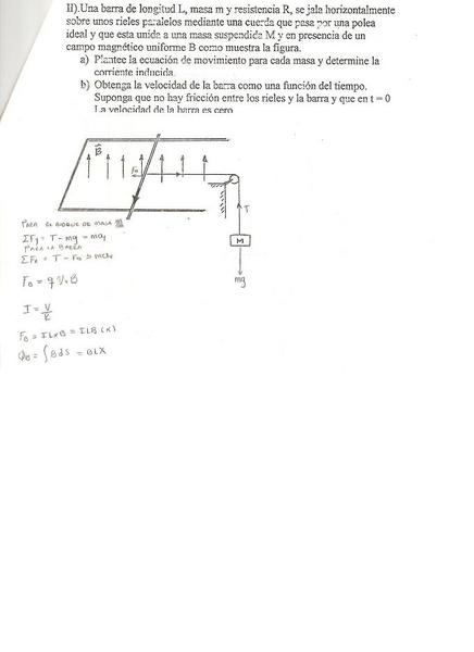 [FONT=Calibri]Una barra de longitud L, masa m y resistencia R, se jala horizontalmente sobre unos riele paralelos mediante una cuerda que pasa por una polea ideal y que está unida a una masa suspendida M y en presencia de un campo magnético uniforme B como muestra la figura.[/FONT]