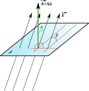 el vector área lo he dibujado yo, en el ejercicio original solamente estaba la superficie, el ángulo , indicaba el valor del área y el valor del campo, y pedian encontrar el flujo de ese vector a través de la superficie .