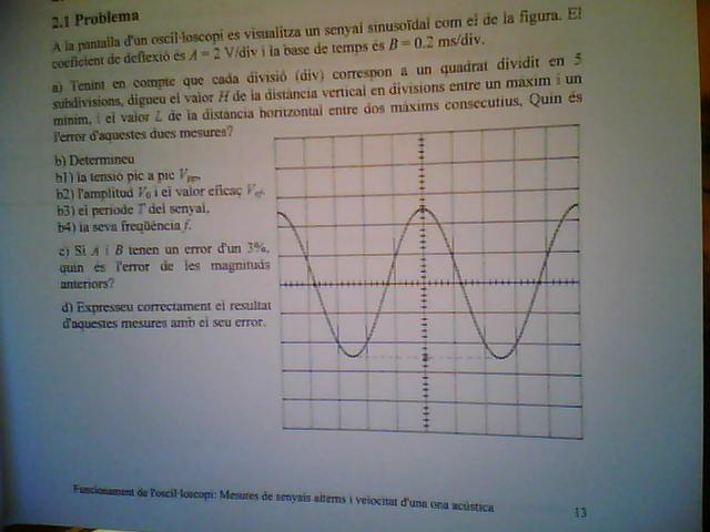 Mi problema es; en la pantalla del osciloscopio se visualiza una señal sinuosidal. El coeficiente de deflexion es A=2V/div i la base de temps es B=0.2ms/div.