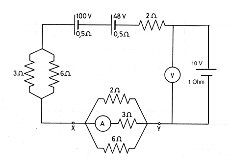 Tengo que determinar las lecturas del voltimetro y del amperimetro (ver imagen).