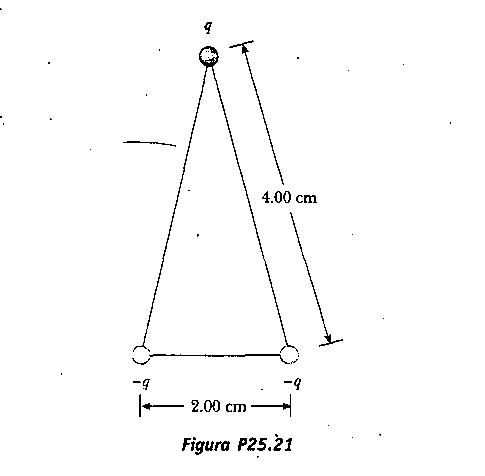 Las tres cargas de la figura están en los vértices de un triángulo isósceles. Calcule el potencial eléctrico en el punto medio de la base, considerando .