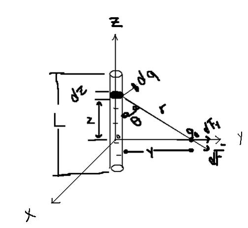 Bueno quisiera saber si alguien podria guiarme a resolver la F en una linea con carga.. Ya que lo eh hecho por el metodo normal en coordenadas cartesianas pero eh visto que algunos autores lo hacen de diferente manera creo que la cambian a cilindrica, se hacerlo para ejemplos como de campo que solo tienen un carga y ya. pero quisiera saber si en F es posible .. aqui les pongo el dibujo.