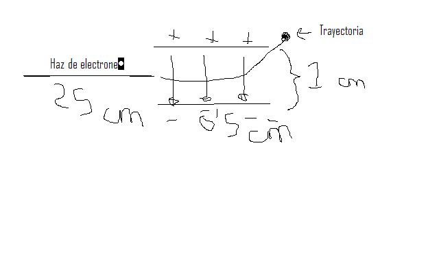 Las placas de un apartao de Thomson (tubo de vacío) son de 0,5 cm de largo y están separadas 1 cm. El extremo de las placas está a 25cm de la pantalla del tubo. La energía cinética de los electrones es de 2,5 Kev. a)Si se aplica una diferencia de potencial de 20 V entre las placas de desviación o deflexión, ¿Cuanto se desviará el haz? b) Hallar el valor de un campo magnético cruzado que permita al haz pasar sin verse desviado.