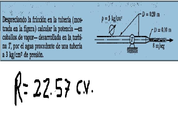 Necesitas calcular el caudal que pasa por la turbina, cosa que puedes hacer con los datos que te dan en el problema, imponiendo la ecuación de continuidad.Escrito por pamplona17 Ver mensajehola amigos pues recurrido aqui por que me encontre ete problema y no lo e podido resover no se si me puedan ayudar grasias ami me da el resultado 13.23 nose :s