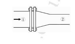 En el caño de la figura circula agua con un caudal de en la dirección de la flecha. La sección del tramo grueso de caño es de , y la del fino de . Se determina que la presión en (1) es de y en (2) es de . Considerando al agua como un fluido ideal incompresible, ¿cuál es la fuerza que debe soportar la brida?
