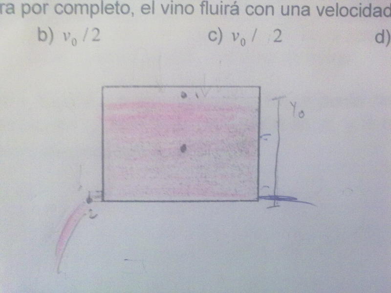 b-) la caja sigue medio vacia , solo que ahora alguien la inclina 45° de modo que la salida se encuentra en el punto mas bajo . cuando se abre totalmente la salida , el vino saldra fluyendo con una rapidez de