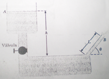 La figura muestra un tanque de agua con una válvula en el fondo. Si esta válvula se abre, cuál es la máxima altura que alcanza la corriente de agua al salir del lado derecho del tanque? Cuál es el alcance sobre la horizontal medido a partir del punto B? Asuma que el área de la sección transversal en A es muy grande comparada con la de B.