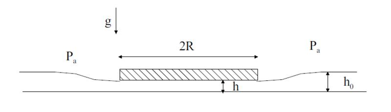 Obtener la ecuación del movimiento de una moneda de radio R y masa M que inicialmente se mueve en el aire a velocidad V0 y que impacta perpendicularmente contra una lámina de agua de densidad y profundidad h0 R. Se supone viscosidad despreciable.