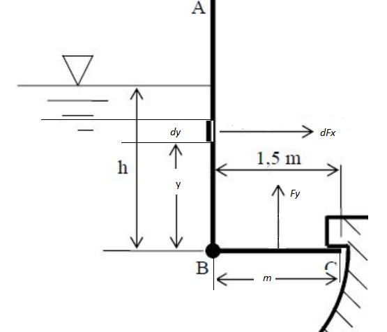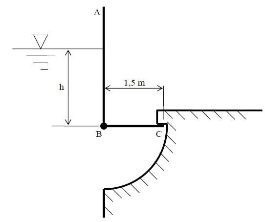 1. Si el nivel de agua h es de 1.5 m, ¿qué reacción (fuerza) se producirá en el punto C?