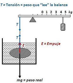 que la balanza hace sobre el cuerpo (que es peso aparente) + Empuje. O sea que, como te escribe Jabato: