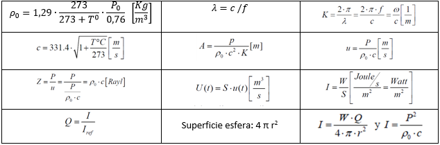 1. Una fuente acústica esférica de 40 [mW] de potencia radia sonido sinusoidalmente en campo libre a 1,5 [kHz]. Suponiendo una temperatura ambiente de 30ºC y una presión atmosférica de 105 [Pa] (ó 0.751 metros de mercurio [mHg]), obtener a 4 [m] del centro de la fuente: