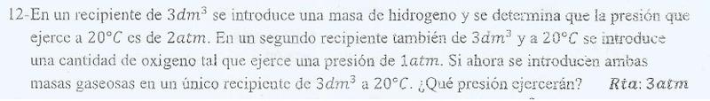 Buenas tardes. Tengo una duda con este problema. Es simplemente sumar las presiones del enunciado? Tiene la falla, tal vez,de contener la respuesta. Pero me crea la duda al mencionar dos gases distintos. Gracias por la orientación.