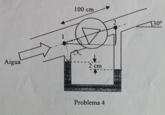 "EL tubo de la figura esta inclinado 30º y circula agua. Entre los dos puntos separados 100 cm hay un manometro de mercurio (d = 13.57) que marca una diferencia de altura de 2 cm, y una bomba que realiza un trabajo de 3 J/kg. Si el diametro en el punto 1 es de 20cm i en el punto 2 es de 10 cm y sabemos que el caudal es de 0,3: