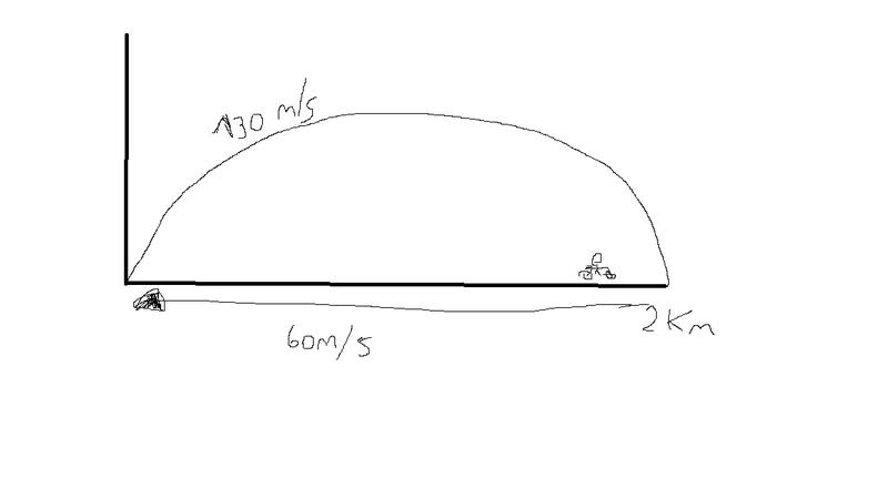 2) La distancia horizontal que debe recorrer el proyectil para impactar contra el pobre motorista es , y los recorrerá en el mismo tiempo que el motorista (t).