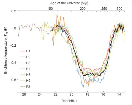 * La anomalía es compatible con la aparición de las primeras estrellas del Universo, (Población III): la luz de esas primeras estrellas ioniza una parte de los átomos de hidrógeno cósmico y altera el ratio de emisión de 21 cm debida a la transición espines paralelos/espines antiparalelos del protón y el electrón del hidrógeno atómico.