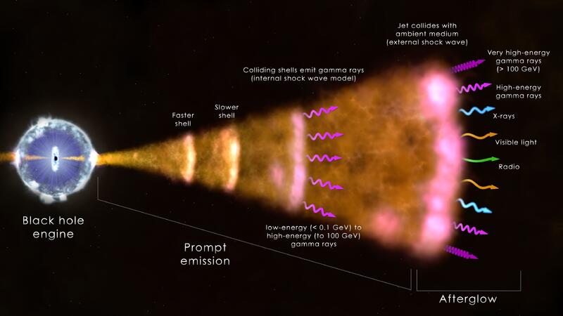 Esquema de un jet GRB. El material rápido alcanza al material más lento, creando ondas de choque, las cuales energizan la materia a energías muy altas. Esta golpea la materia alrededor del GRB, iluminándolo y creando el afterglow.