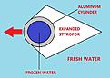 Experimento termodinámico con un rotor de poliestireno expandido que contiene tres cilindros de aluminio llenos de agua congelada.